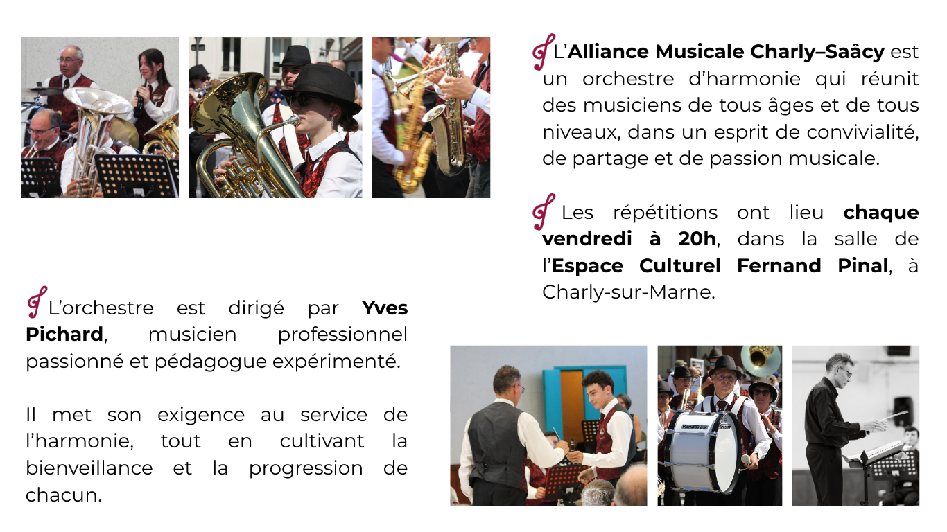 Vous jouez d'un instrument à vent ou de percussion ? Rejoignez-nous ! Quel que soit votre niveau, vous êtes les bienvenus pour partager l'aventure musicale.